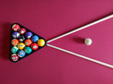 Priložen pribor: 4 lesene biljard palice, komplet oštevilčenih krogel Ø 57 mm, trikotnik, pokrivalo, krede.